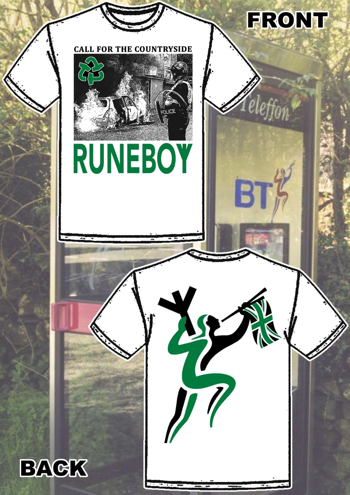 Double Sided Design Printed With Black And Green Ink On White Heavy Cotton T-shirts.
